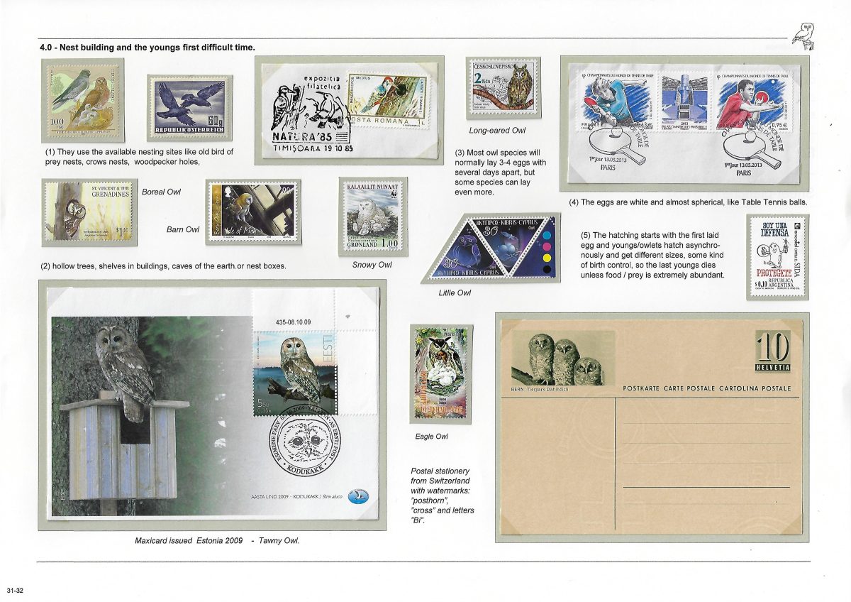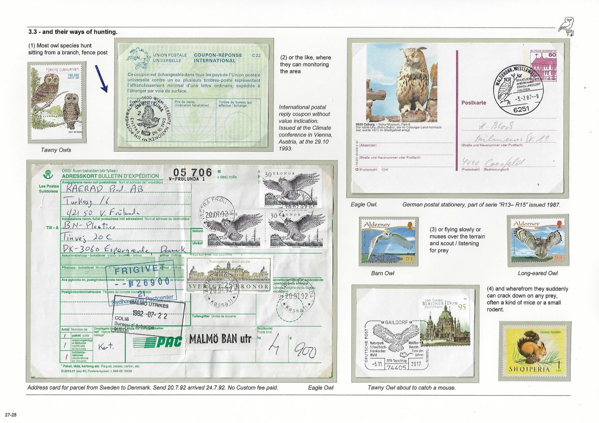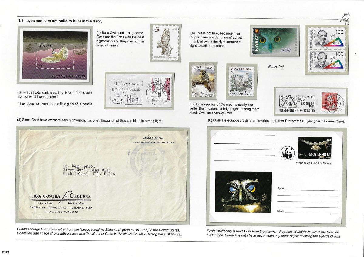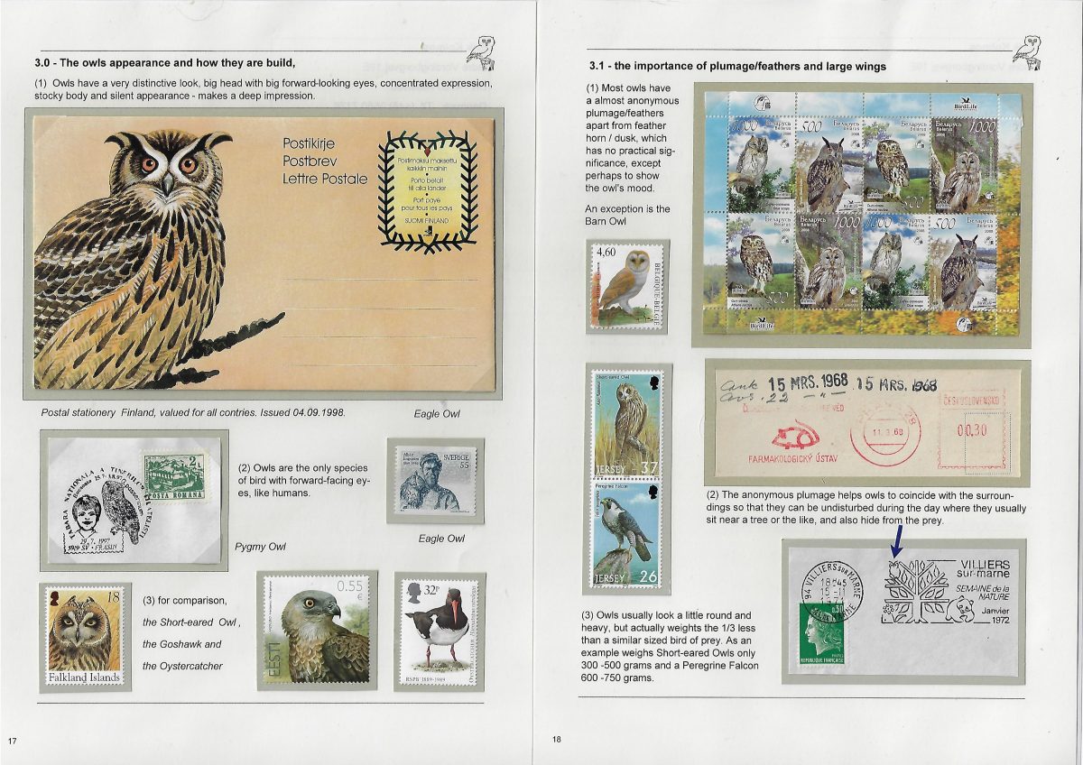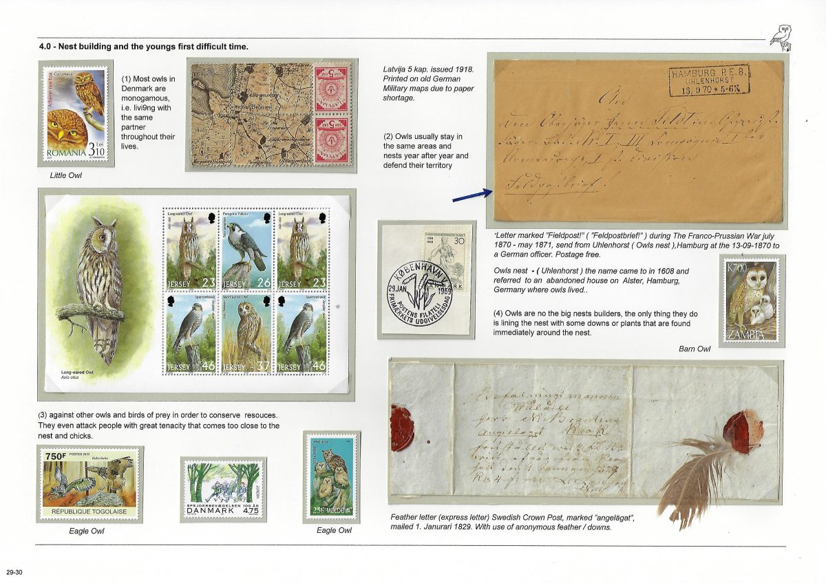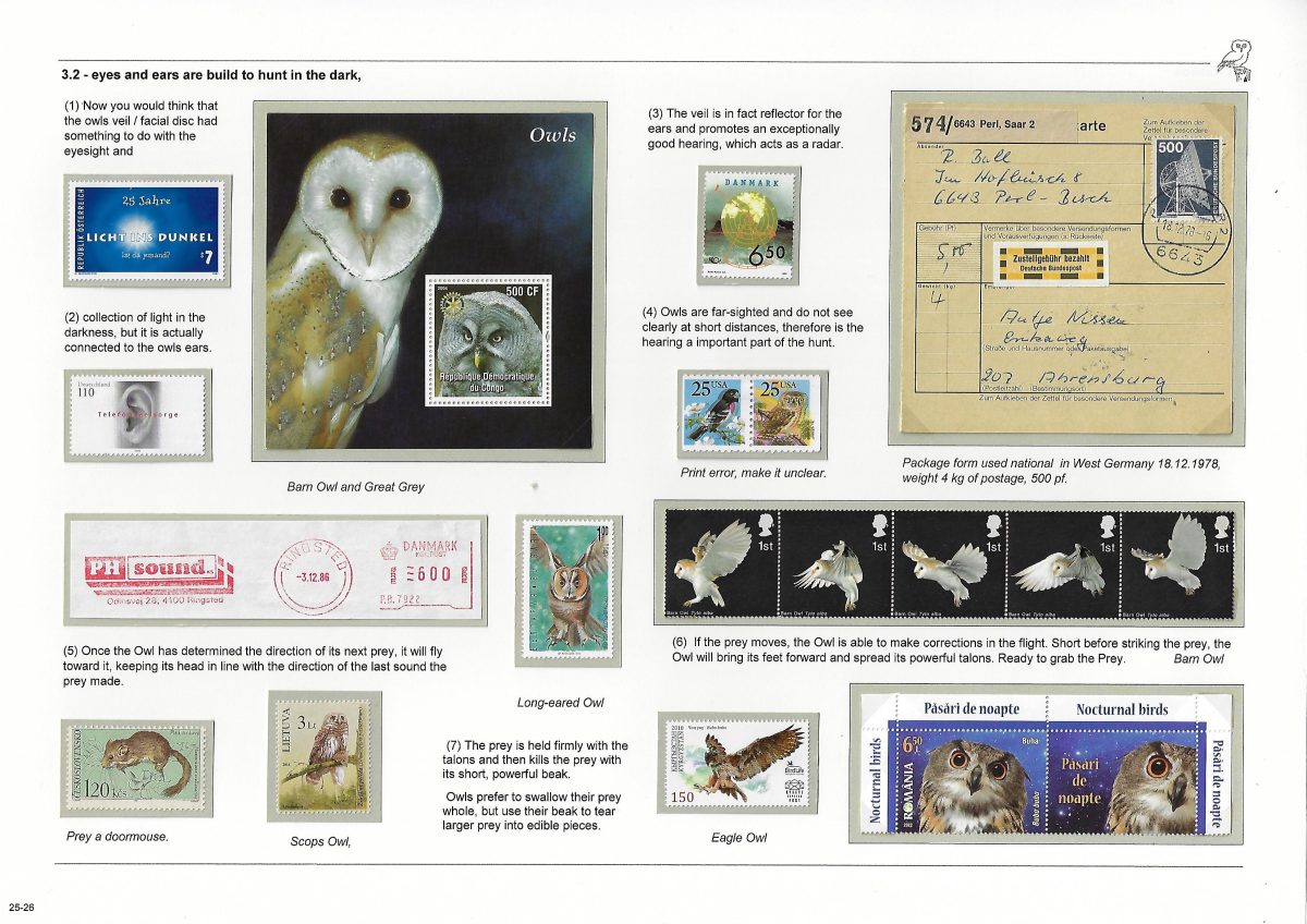 Undertitel: Owls breeding and seen in Denmark, their history and sometimes difficult life. Exponatet er en historie om uglernes historie, den tilknyttede overtro på godt og ondt og deres til tider noget vanskelige liv i Danmark. Ud af de 7 ynglende uglearter her i landet, er der kun 2 af arterne, der er almindeligt forekommende og ikke konstant er truet af udryddelse. Jeg har forsøgt, at anvende så meget dansk materiale som muligt og er opbygget som et tematisk eksponat. Eksponatet har sidst været udstillet på Nordia 24 i Norge, hvor den opnåede 86 point for så, at blive dykket 11 point på Hafnia 2024 i København. Exponatet er siden blev redigeret kraftigt. Gode råd og kommentarer er velkomne. Med venlig hilsen og god fornøjelse. Erik Kolmos.