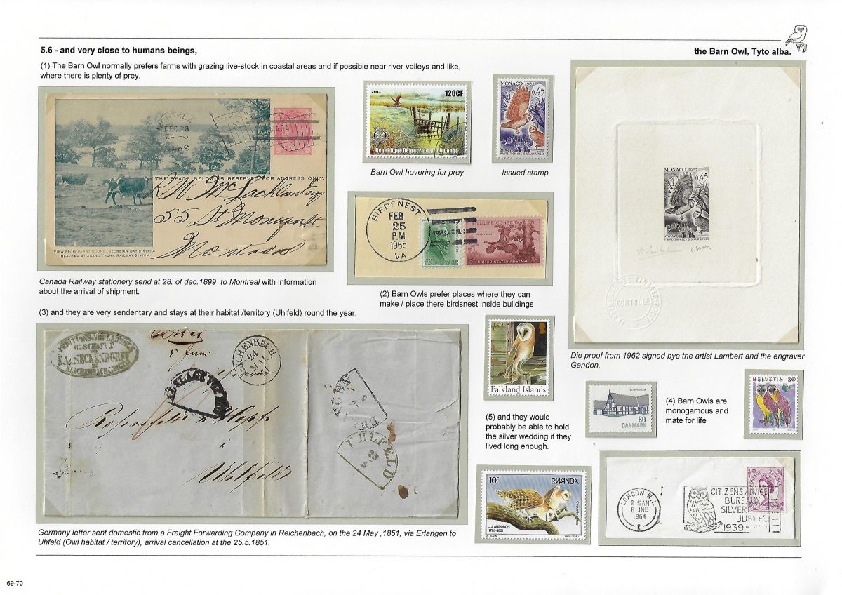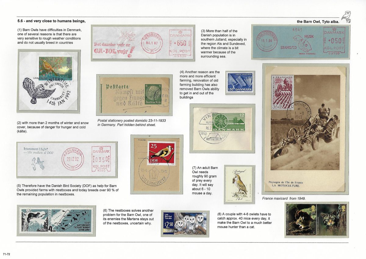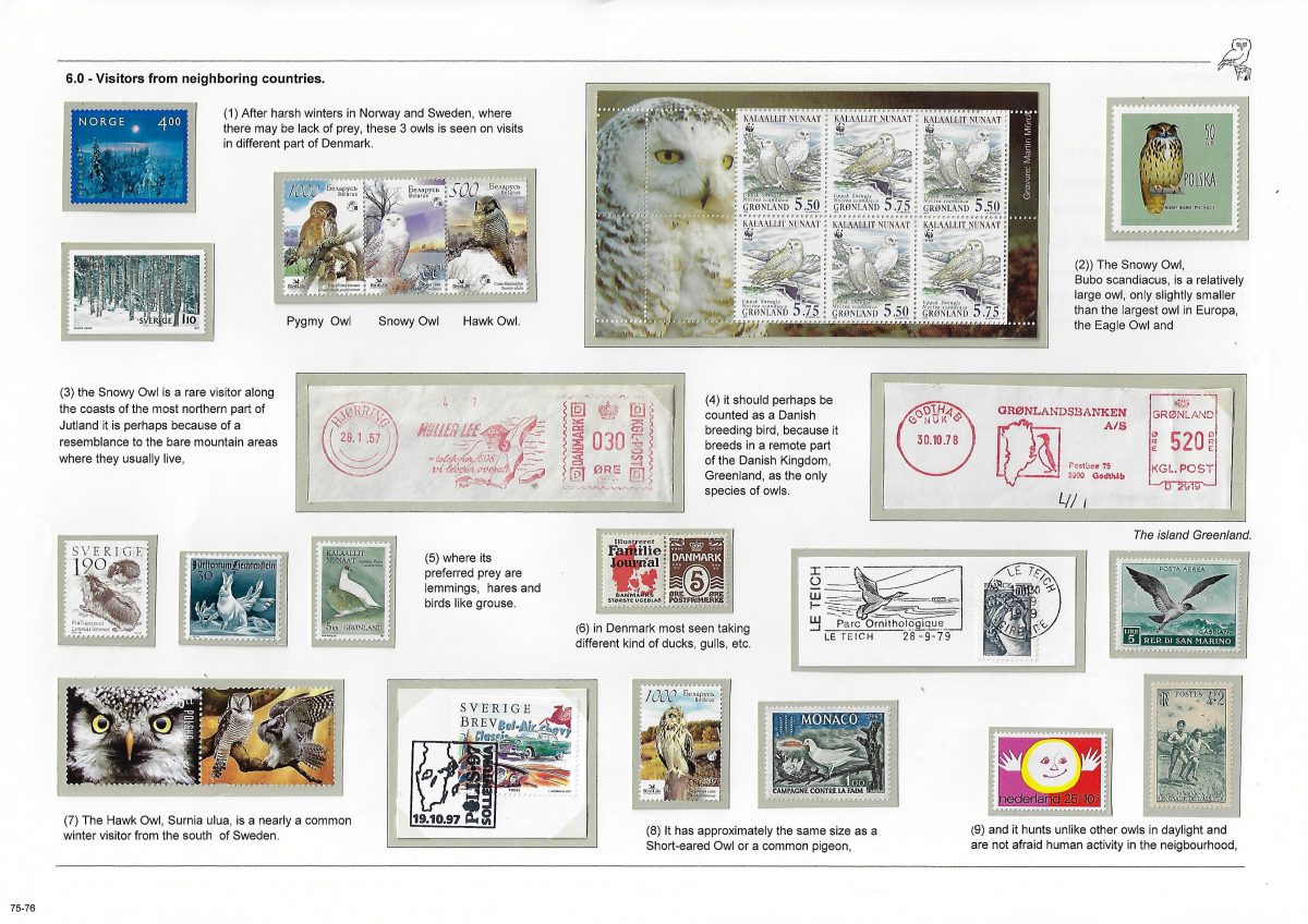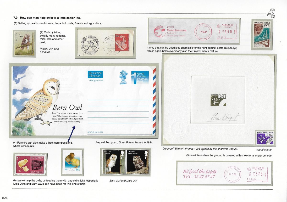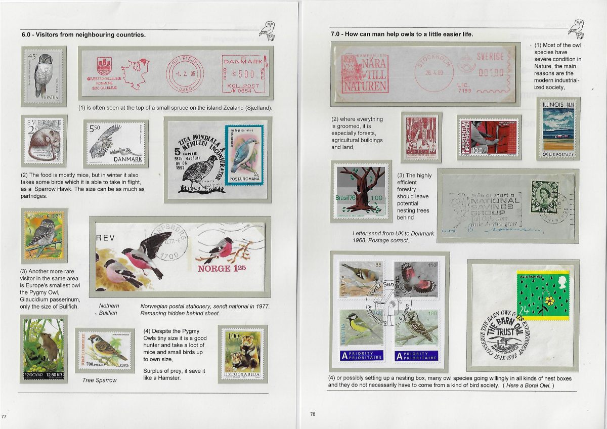 Undertitel: Owls breeding and seen in Denmark, their history and sometimes difficult life. Exponatet er en historie om uglernes historie, den tilknyttede overtro på godt og ondt og deres til tider noget vanskelige liv i Danmark. Ud af de 7 ynglende uglearter her i landet, er der kun 2 af arterne, der er almindeligt forekommende og ikke konstant er truet af udryddelse. Jeg har forsøgt, at anvende så meget dansk materiale som muligt og er opbygget som et tematisk eksponat. Eksponatet har sidst været udstillet på Nordia 24 i Norge, hvor den opnåede 86 point for så, at blive dykket 11 point på Hafnia 2024 i København. Exponatet er siden blev redigeret kraftigt. Gode råd og kommentarer er velkomne. Med venlig hilsen og god fornøjelse. Erik Kolmos.